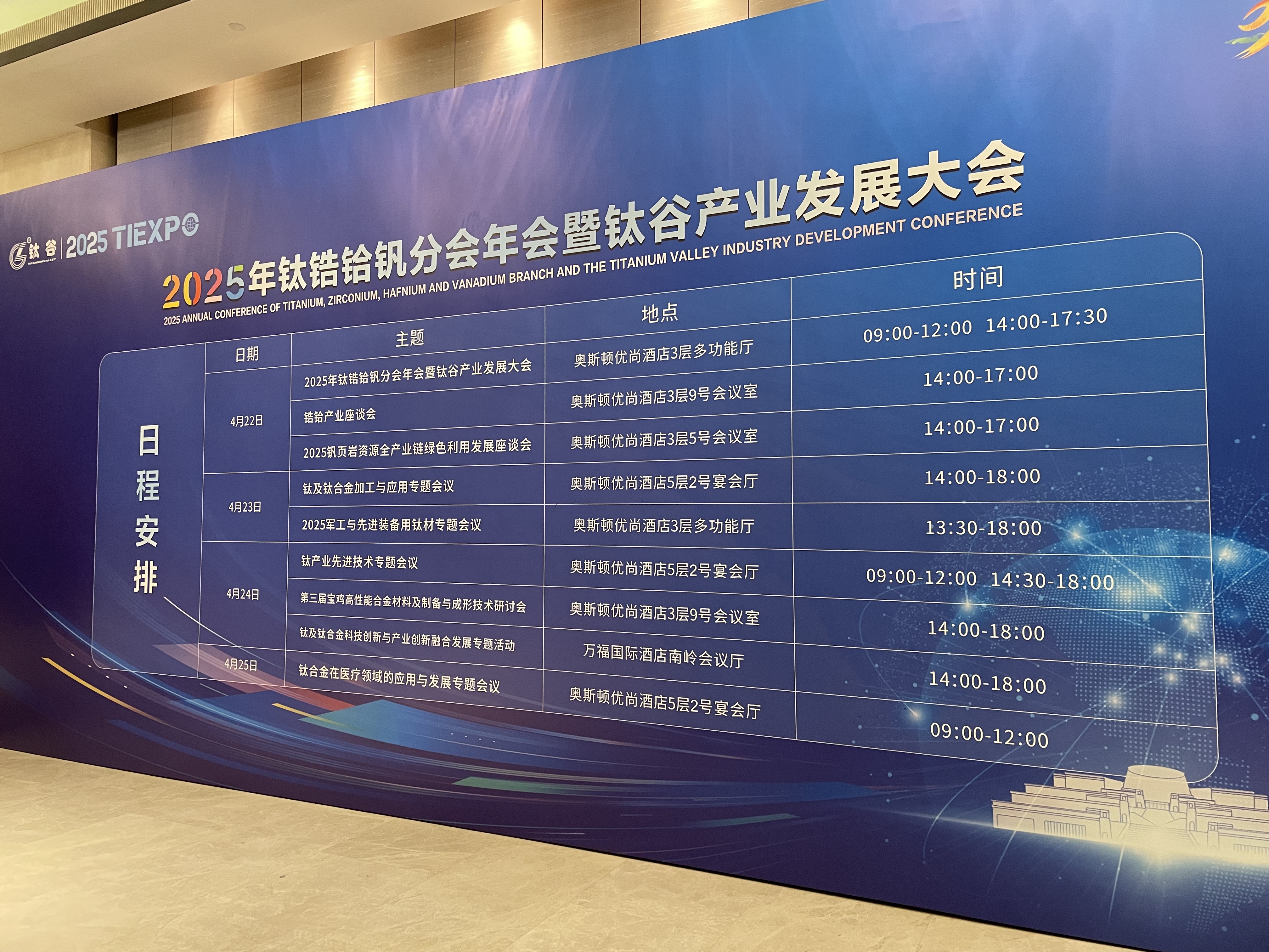 The 2025 Baoji Titanium Valley International Titanium Industry Expo was held in Baoji City from April 22nd to 26th. It aims to deepen cooperation and mutual benefit in the domestic and international titanium industry, accelerate cross-border integration of applications, and fully promote the high-quality development of Baoji's titanium industry. The 2025 Baoji Titanium Valley International Titanium Industry Expo, jointly organized by the Baoji Municipal People's Government and the Titanium, Zirconium, Hafnium and Vanadium Branch of the China Nonferrous Metals Industry Association It will be held at Baoji International Convention and Exhibition Center from April 22nd to 26th.